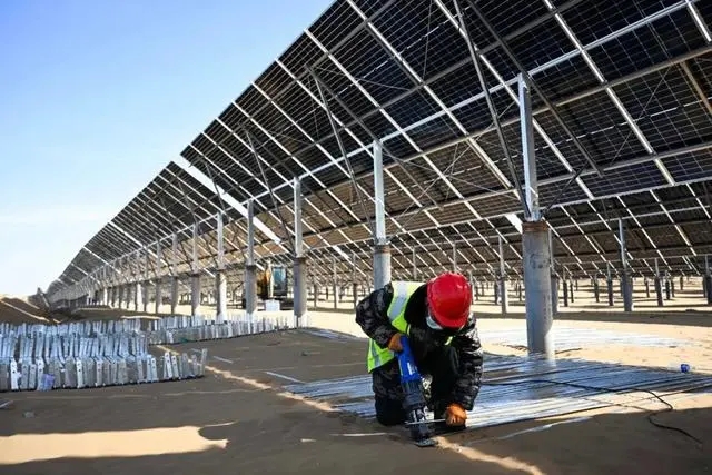 工人在內(nèi)蒙古鄂爾多斯市達(dá)拉特旗光伏發(fā)電基地作業(yè)。