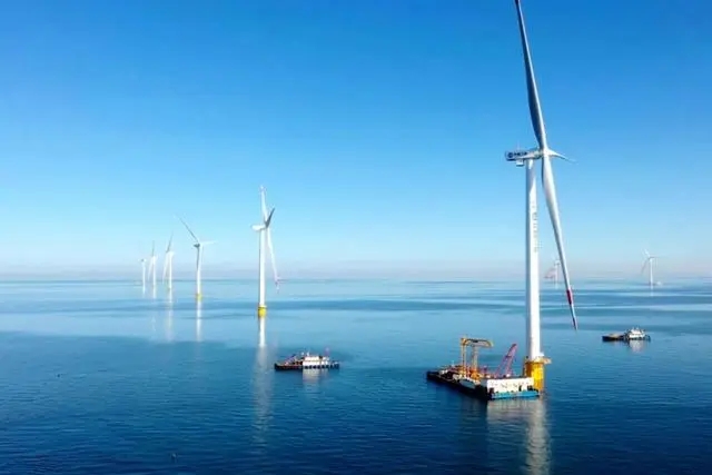 △在碧海藍(lán)天的萊州灣海域的昌邑海洋牧場(chǎng)與三峽300兆瓦海上風(fēng)電融合試驗(yàn)示范項(xiàng)目50臺(tái)6兆瓦風(fēng)電機(jī)組。
