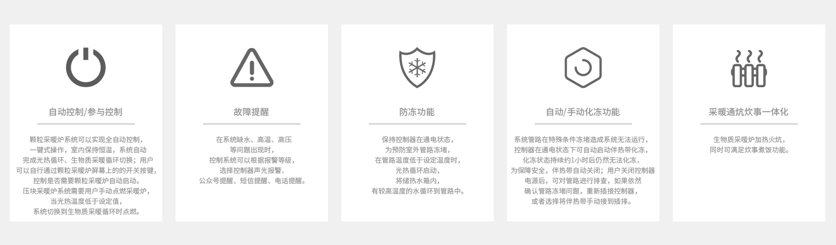 當(dāng)天氣不好或其他原因,太陽輻射能量不充足,水箱內(nèi)水溫不能滿足啟動(dòng)采暖功能使用要求時(shí),云控器控制電動(dòng)二通閥開啟,啟動(dòng)室內(nèi)采暖循環(huán)模式,自動(dòng)或手動(dòng)點(diǎn)燃生物質(zhì)采暖爐,將通過生物質(zhì)采暖爐內(nèi)部的水加熱,從而將熱量傳遞到房間內(nèi),提升房間內(nèi)的環(huán)境溫度。生物質(zhì)顆粒爐可自動(dòng)控制燃燒功率;壓塊爐需要手動(dòng)調(diào)節(jié)。