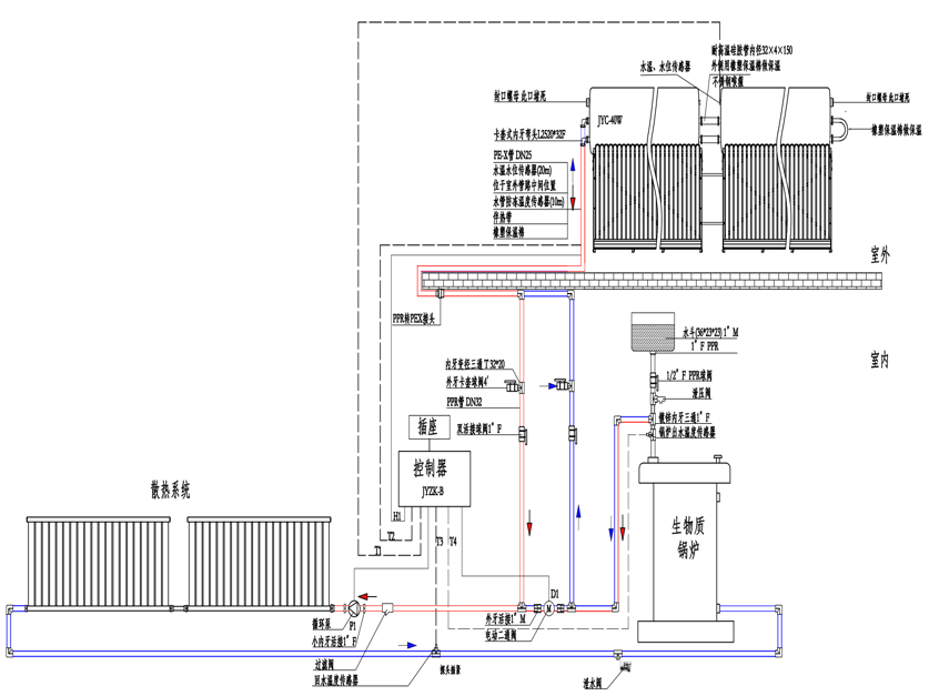1.本戶用采暖系統(tǒng)系統(tǒng)由部分構(gòu)成:光熱采暖機(jī)、生物質(zhì)采暖爐、循環(huán)水泵、云控器及水路管線等。